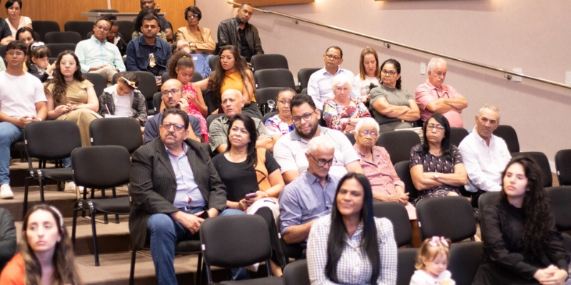 Realizada no auditório da Fessul, a sessão reuniu um público expressivo. O espaço esteve completamente lotado por fiéis, amigos e familiares do Pastor Salvador Antunes, que acompanharam a cerimônia com emoção e respeito.